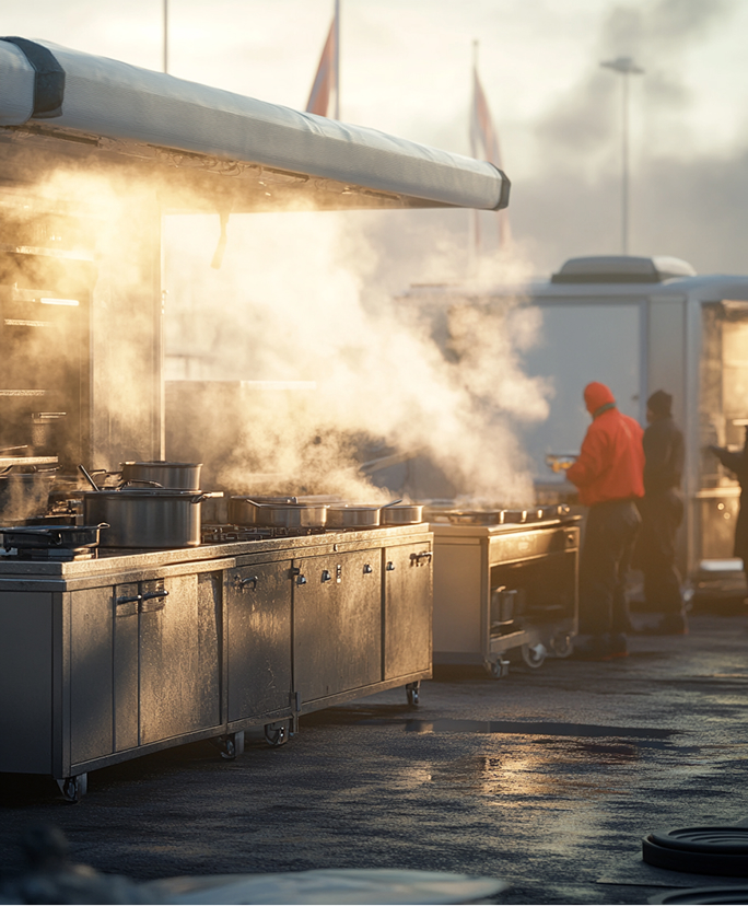 Нашите мобилни кетъринг решения осигуряват напълно оборудвани кухни за приготвяне на храна в полеви условия. Те включват високоефективни системи и модули за готвене, кухненски ремаркета и контейнери, както и разнообразни аксесоари за оптимизиране на процеса. Създадени за гъвкавост и бърза реакция, те гарантират качествено и безопасно приготвяне на храна дори в най-предизвикателните условия.